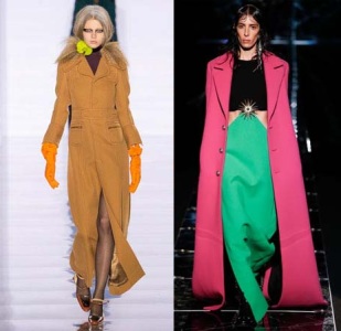 Цветовая гамма в этом ряду чуть шире, чем в случае с классическим пальто, но основная тенденция та же – главная роль отводится сдержанным оттенкам, привычным для холодных сезонов. Однако здесь уже чаще встречаются модели с комбинированными деталями – добавляются крупные вставки контрастных или близких цветов и других фактур (кожи, меха, текстиля). Довольно популярны шотландская клетка и чёрно-белые абстрактные или геометрические мотивы.