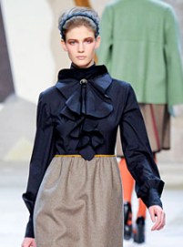 Характерная примета блуз в стиле семидесятых – свободные рукава, собранные у запястья резинкой или плавно расширяющиеся книзу. Свободный крой делает такие модели особенно удобными, а правильный выбор материала позволит с одинаковым успехом дополнить блузой и деловой гардероб, и, по примеру американского дизайнера Дианы фон Фюрстенберг, даже гардероб вечерний. В новом сезоне осень-зима 2011-12 фон Фюрстенберг предлагает стильную альтернативу обычным коктейльным платьям – элегантную юбку-карандаш с вышивкой золотой нитью в сочетании с изысканной блузой в стиле семидесятых из нежного шелка насыщенных и ярких тонов, от бирюзового до сочного оттенка фуксии. А в коллекции модного бренда Tory Burch блузам в стиле семидесятых нашлось применение принципиально иное – модели, привлекающие внимание пестрым мелким принтом и декоративным бантом-завязкой на шее отлично дополняют расклешенные брюки с высокой талией в стиле семидесятых. Итальянский модный бренд Gucci, тем временем, удивительно гармонично соединяет в новой коллекции осень-зима 2011-12 стиль семидесятых и самые яркие оттенки: блузы из последней коллекции дома Gucci привлекают внимание, в первую очередь, насыщенными, глубокими, не по-осеннему яркими оттенками винного, бирюзового, пурпурного.